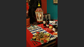 Tato útulná místnost s modrými okenicemi, židlemi na stropě a hravými malbami na zdech nabízí ideální prostředí pro soukromou nebo firemní akci. Přijďte si pochutnat na pečených paprikách nebo čerstvých kalamári grilovaných na lávovém grilu.